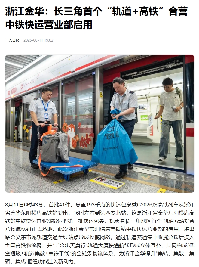 8月11日,長(zhǎng)三角首個(gè)“軌道+高鐵”合營(yíng)中鐵快運(yùn)營(yíng)業(yè)部啟用。該營(yíng)業(yè)部將串聯(lián)金義東市域軌道交通全線站點(diǎn)形成收攬網(wǎng)絡(luò),在全線31座車站均可辦理業(yè)務(wù),通過(guò)軌道交通集中收攬分撥后接入全國(guó)高鐵物流網(wǎng)。